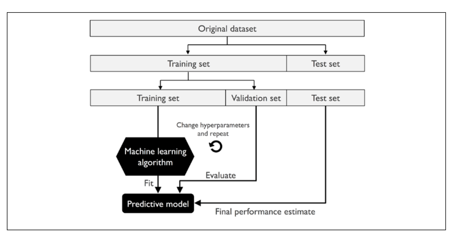 When good hyperparameter values are found, we retrain the model on the whole training dataset, yielding a final performance estimate by evaluating the independent test set.