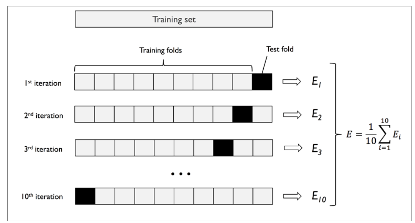 The idea is to split the training set into \(k\) folds, or splits, and with no replacement. \(k-1\) folds are used for training; one fold is used for evaluation.