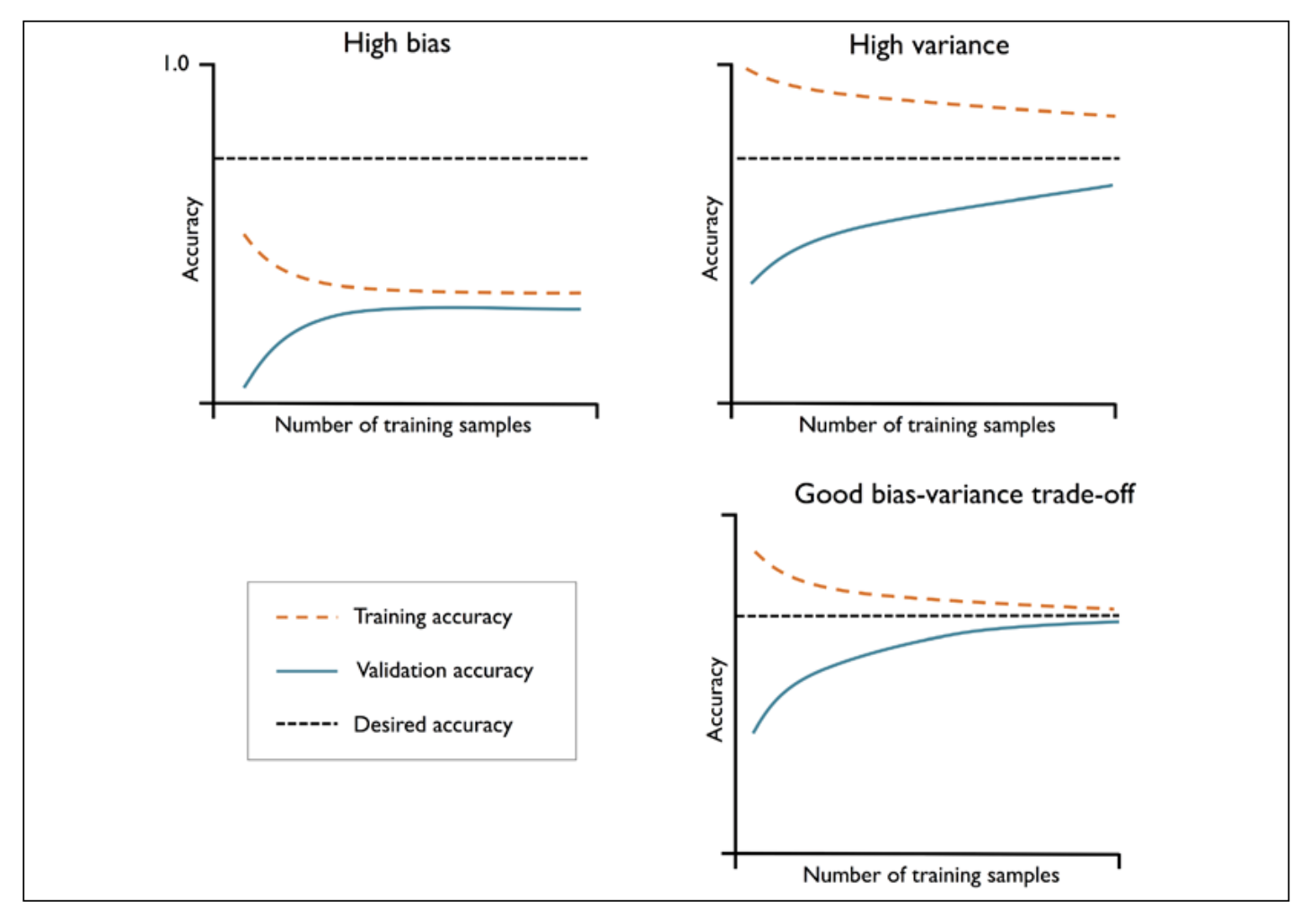 | High Bias | Low training and cross-validation accuracy, underfitting | Raise number of parameters (add'l features); lower degree of regularization (SVMs), logistic regression classifiers |